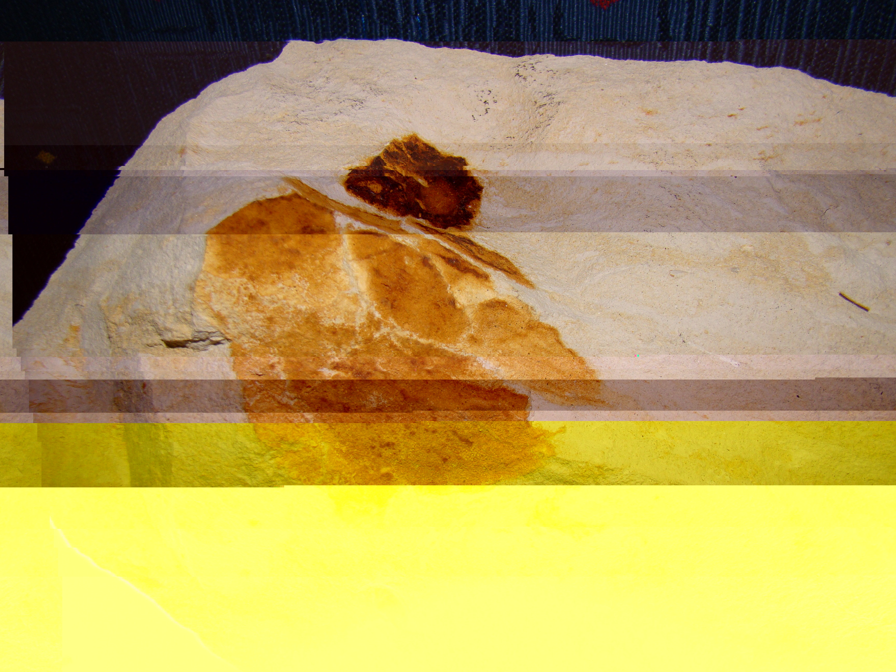Sama skałka to może być kredowy margiel, a ten mineralny wykwit - limonit. Nie jest to raczej skamieniałość, choć gąbki potrafią być czasem zachowane w formie takich właśnie duchów. Z tym że bez skali, danych dotyczących lokalizacji i wieku, oraz bez okaz w ręku - to tylko zgadywanka. Odpisuję dopiero dziś, bo wcześniej nie zauważyłem że to Ty pytasz i nie chciało mi się produkować ;P