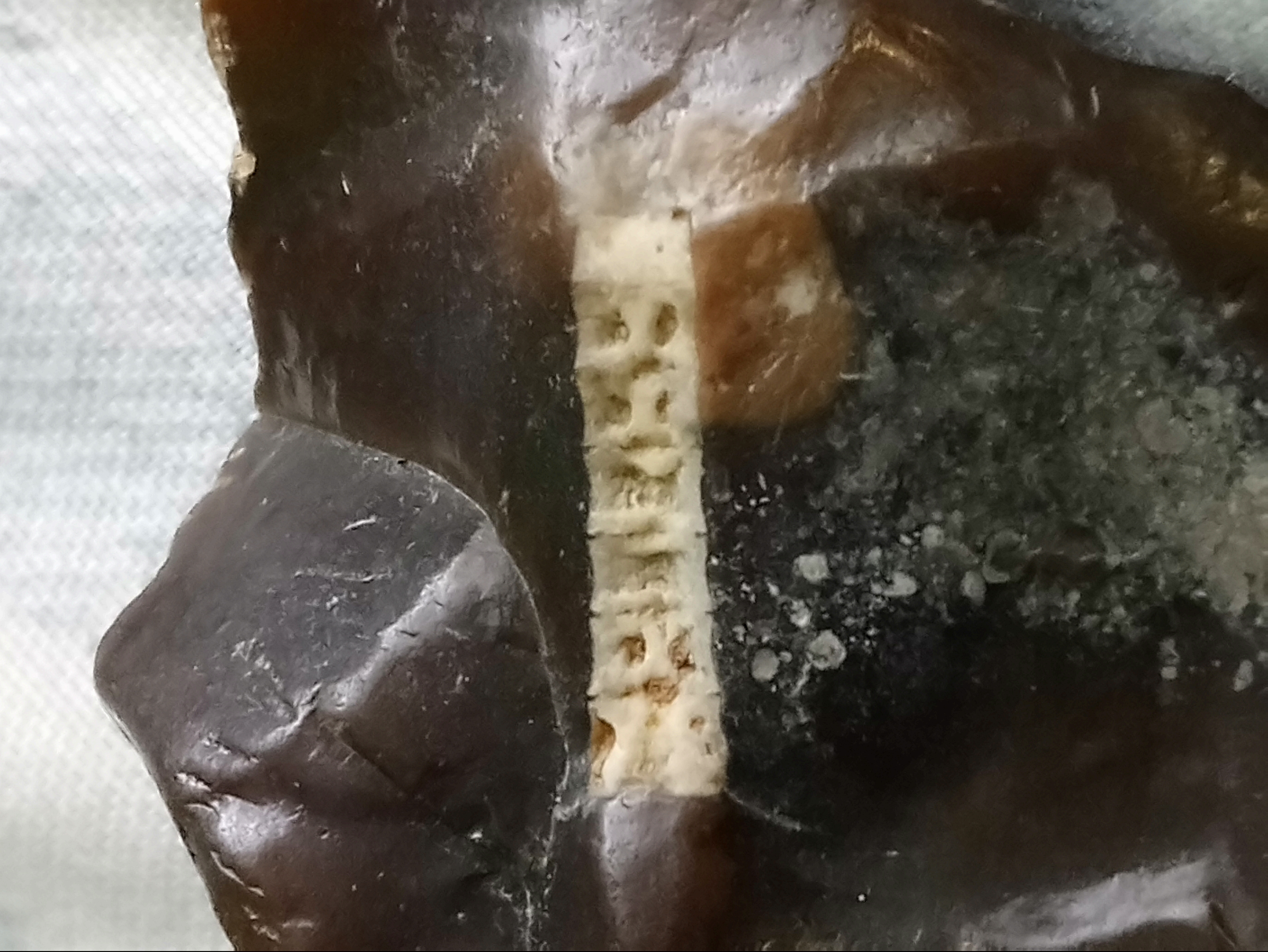 To mi wyglada na fragment krégoslupa ryby. Mógl to byc jeszcze fragment lodyzki liliowca, ale w tym przypadku nie powinno byc tych otworow. Jedne i drugie moga byc uwiezione w krzemieniu, bo nie ulegaja rozpuszczeniu.