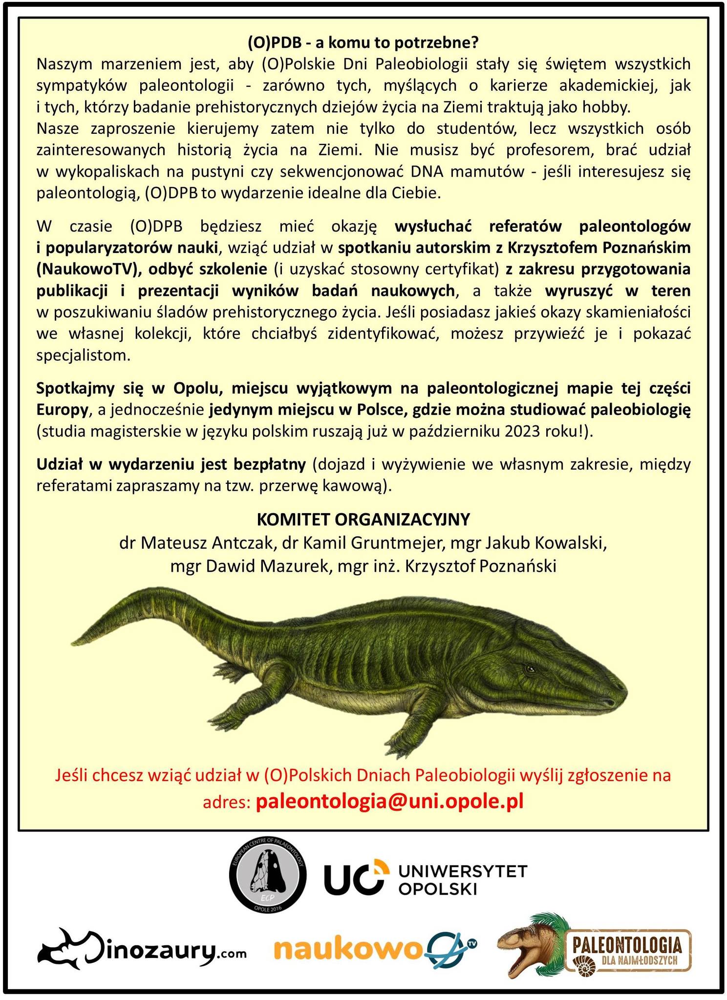 Witam. Chciałem zaprosić wszystkich chętnych do udziału w I (O)Polskich Dniach Paleobiologii. Jest to sympozjum, które odbędzie się w dniach 14-15.05 tego roku w Opolu, na Uniwersytecie Opolskim. Zaplanowane są wystąpienia osób związanych z paleontologią i popularyzacją nauki. Dodatkowo będzie można wziąć udział w wycieczce do kamieniołomu Odra w poszukiwianiu skamieniałości kredowych organizmów. Udział w sympozjum jest darmowy ale trzeba się wcześniej zapisać mejlowo. Ewentualny nocleg trzeba sobie załatwić we własnym zakresie - polecam akademiki UO (tanio, wygodnie i blisko). W razie ewentualnych pytań proszę śmiało pisać na mejla zamieszczonego w ogłoszeniu - na pewno na wszystkie zapytania odpowiemy. Pozdrawiam serdecznie i zachęcam wszystkich zainteresowanych do udziału