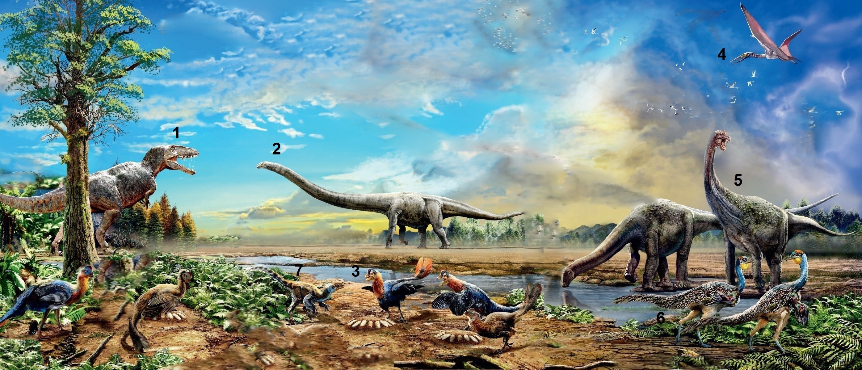 1 to przedstawiciel karszarodontozaurydów, 2 to jakiś zauropod (wstępnie brałem go za mamenchizauryda), 3 owiraptorozaur bliżej kenagnatyd, 4 azdaharyd, 5 przedstawiciel zaawansowanych tytanozaurów z kladu Lithostrotia.