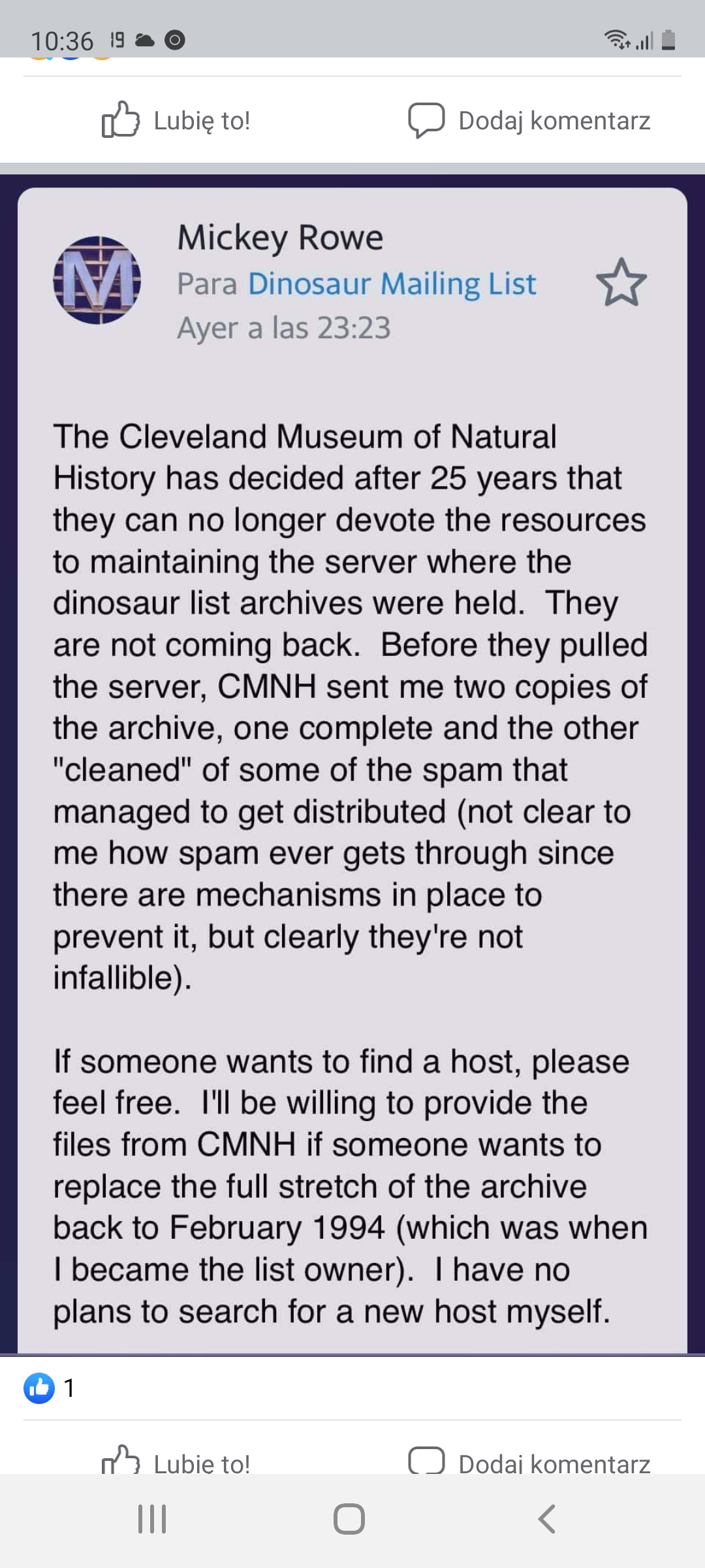 Archiwalne wpisy (nie wszystkie, raczej starszych będzie dostępnych więcej niż nowszych) do lutego 2021 r. można przejrzeć w kopii strony: https://web.archive.org/web/20210309164 ... .cmnh.org/