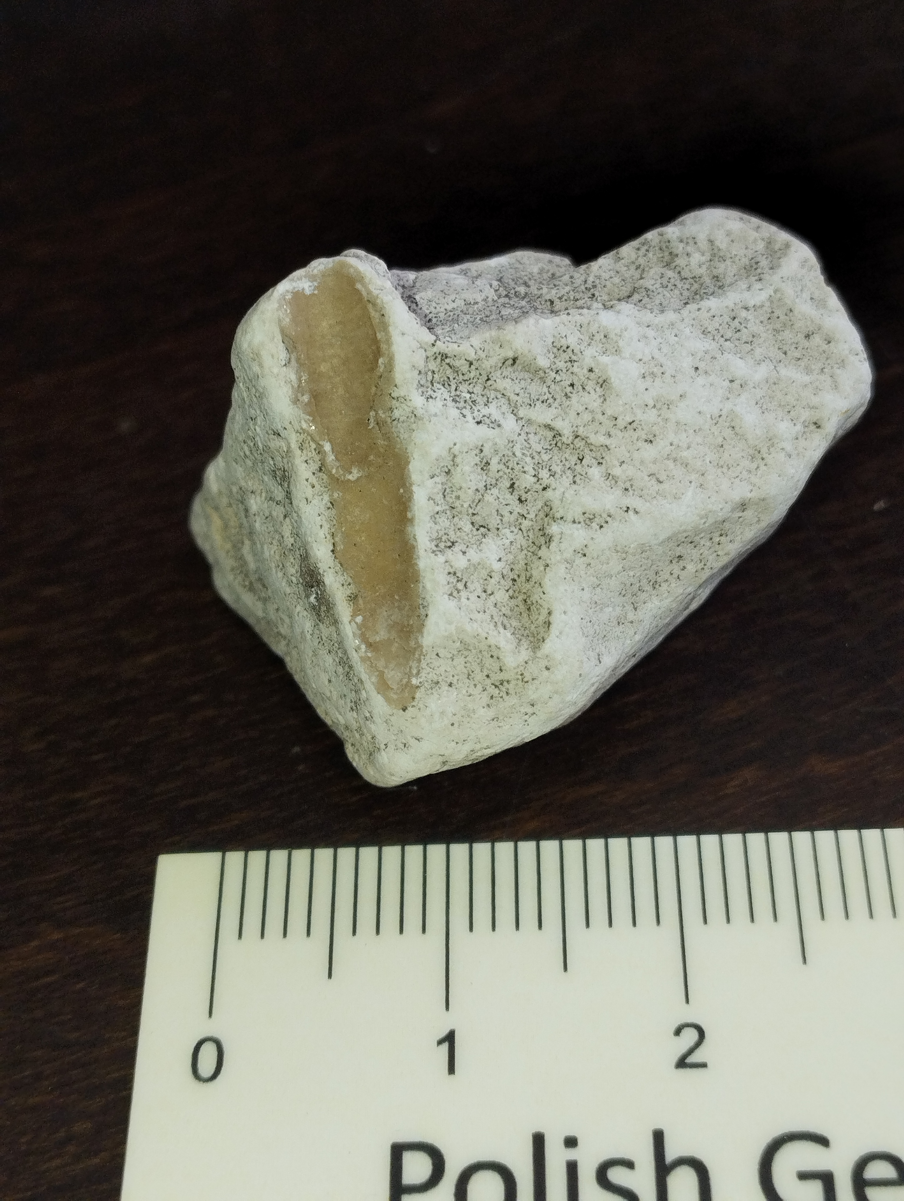 Dzień dobry. Znalazłem taki okaz w żwirku ozdobnym przy placu zabaw. To ząb sphenodusa czy belemnit? Nie jest cały, została grubsza warstwa. Z góry dziękuję i życzę ciekawych znalezisk.