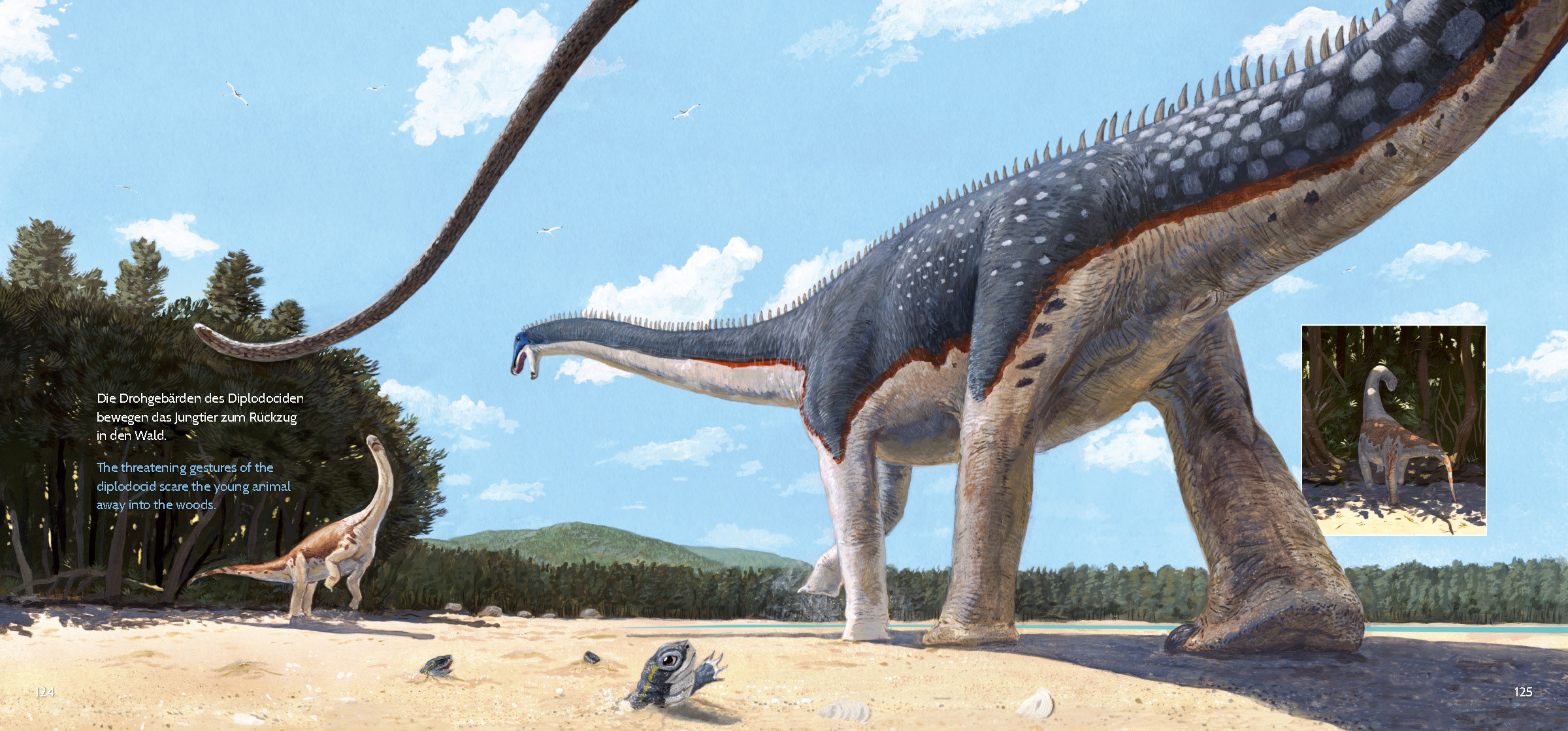 Krótki komentarz łączący naukę z opowiadaniem historii (którego czytając nie mogłam nie słyszeć w głowie głosu Sir Davida Attenborougha) połączony z przepięknymi, barwnymi, wypełnionymi po brzegi panoramicznymi ilustracjami, namalowanymi z dbałością o szczegóły, z których każda to prawdziwa uczta dla miłośników paleoartu, ożywia ten świat i pozwala nam w pełni się w nim zanurzyć.