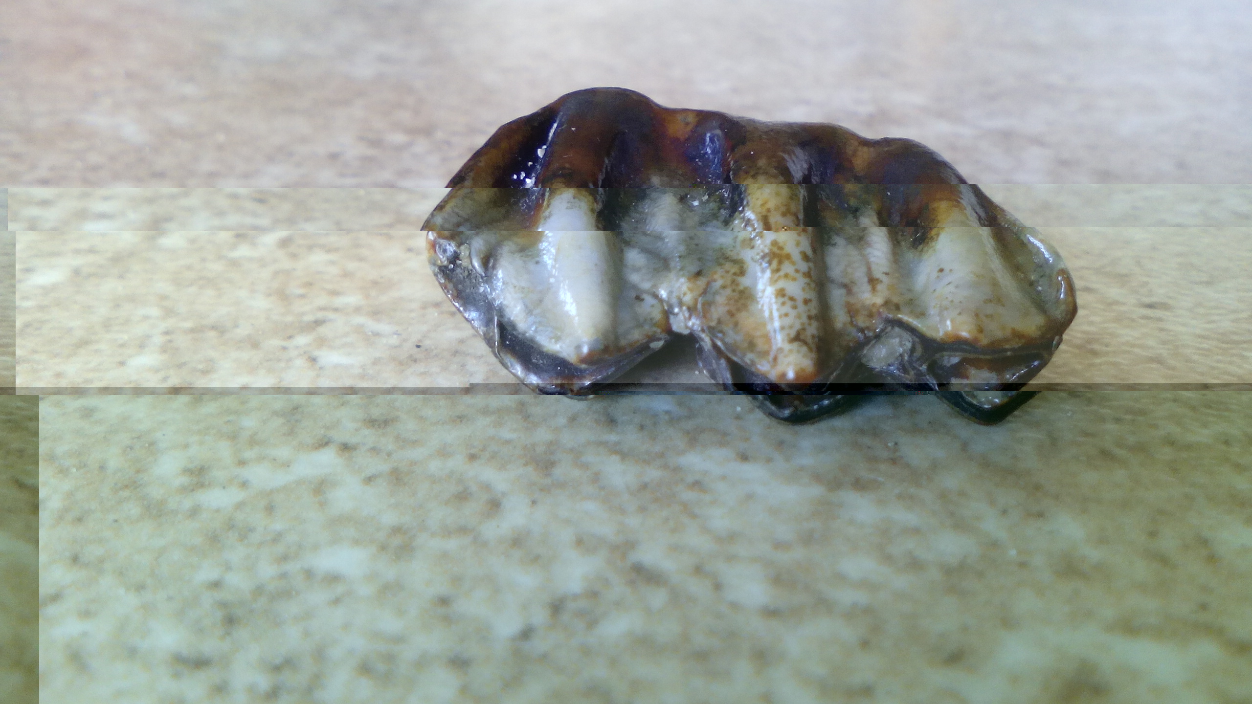 Wydaje mi się, że jest to jakiś ząb, ale nie jestem pewny. Jest to długości około 3cm.