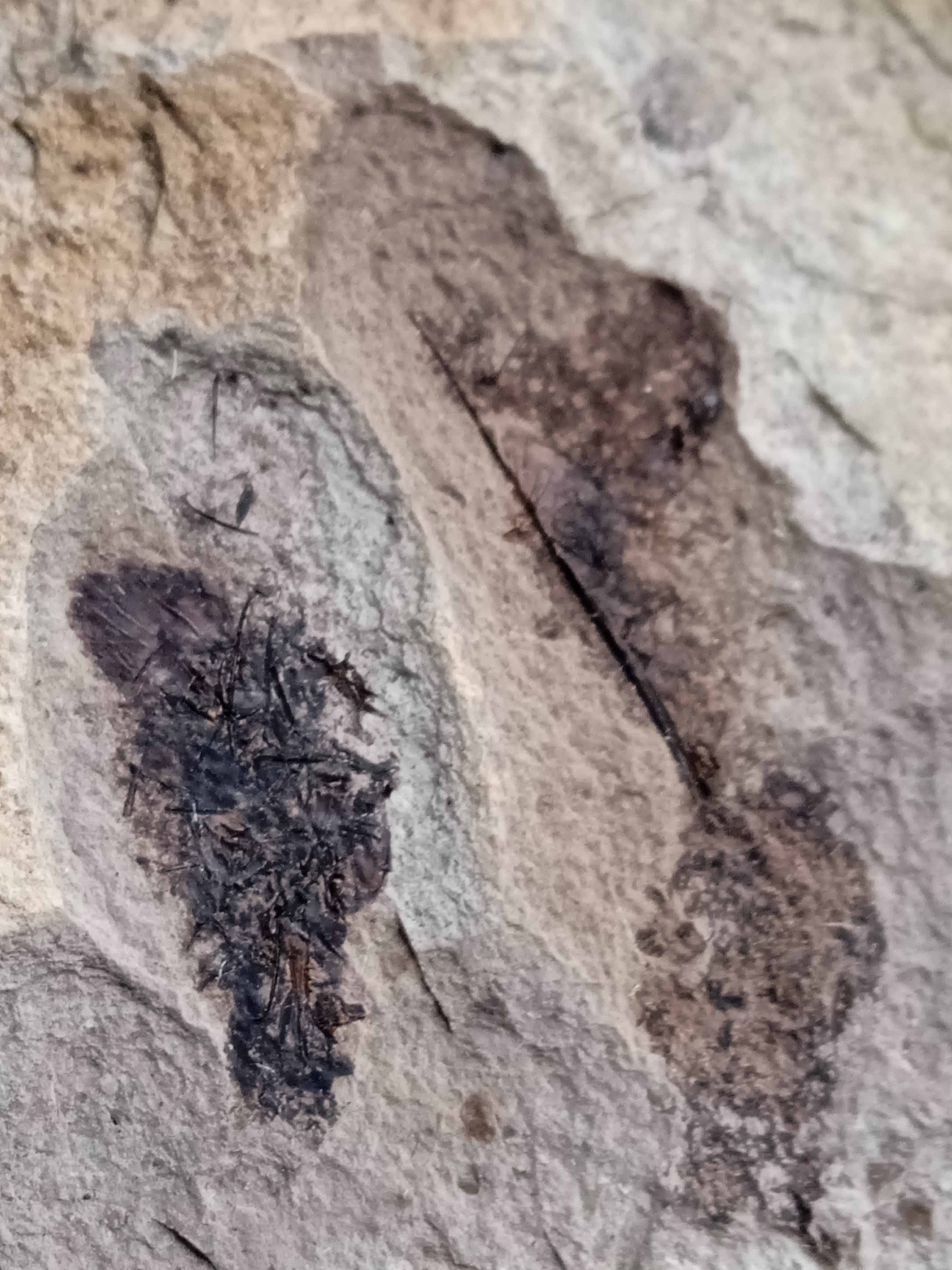 Dzień dobry. W łupku znalazłem takie coś. Niestety nie wiem skąd przywieziono kamień, ale leżał w ogrodzie. Długość tego czegoś to 2cm, a tego mniejszego 1 cm. Obok są dwa obiekty przypominające kwiatki.