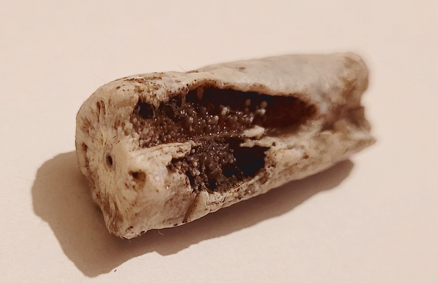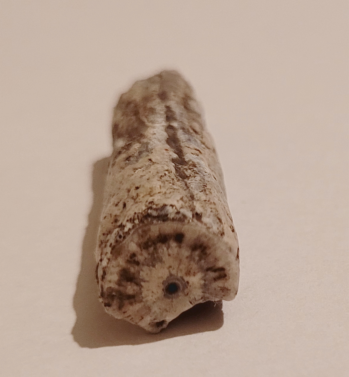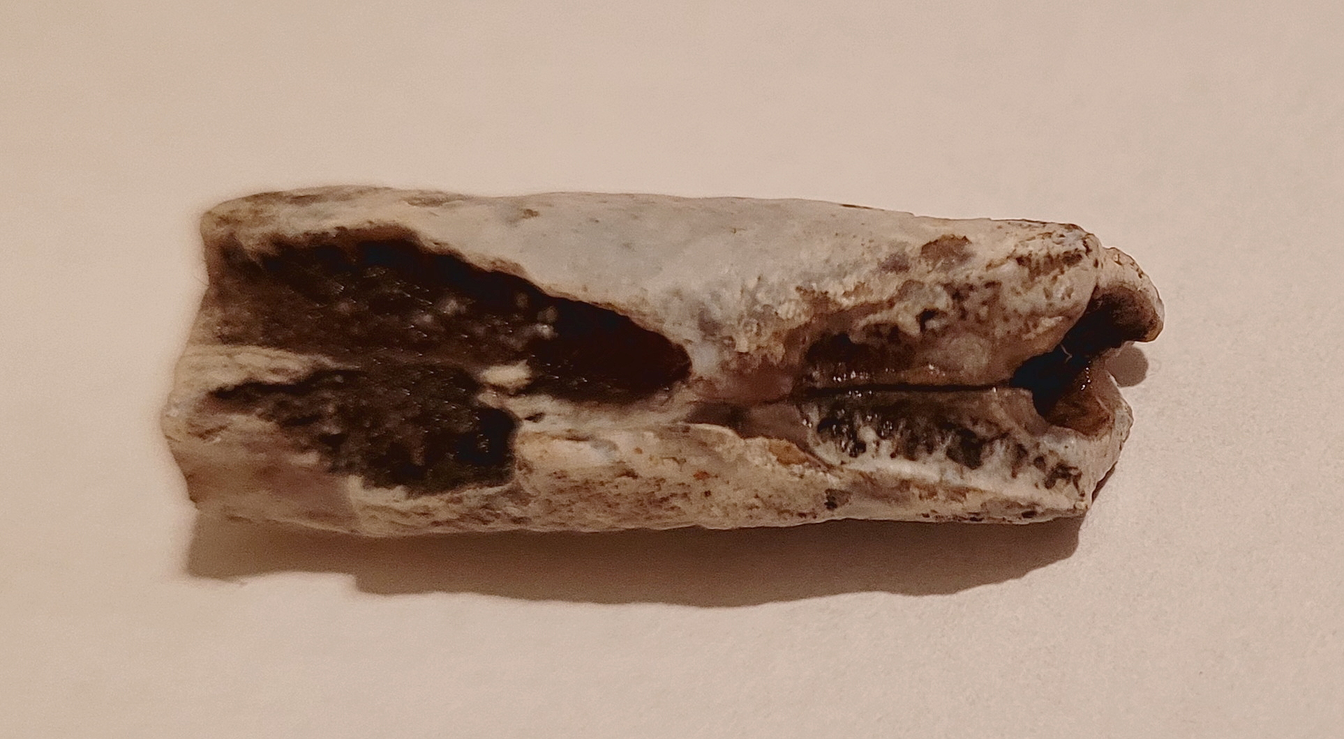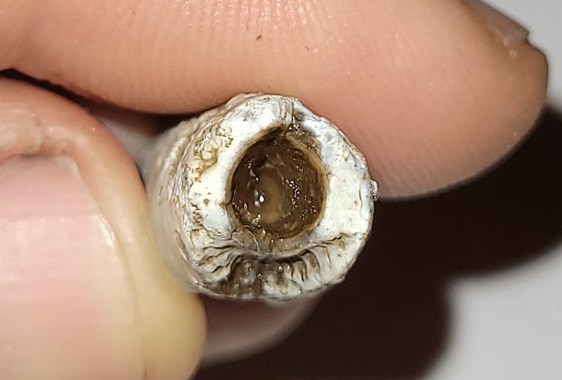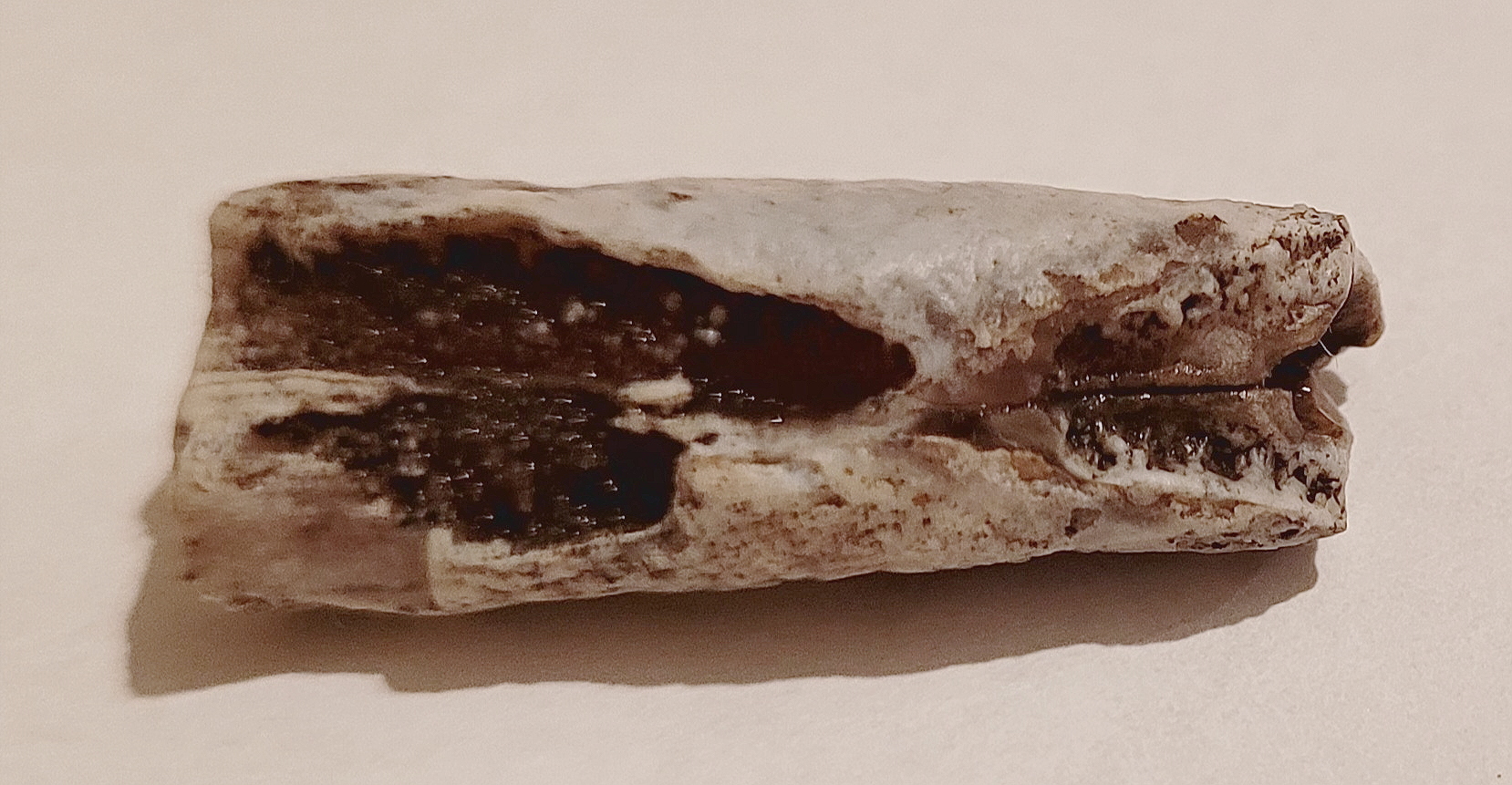Fragment rostrum (ostatniej części "muszli") belemnita, po pewnych przejściach. W miejscu ukruszenia się jej zaczęły krystalizować jakieś minerały. To zagłębienie z jednej strony, to miejsce gdzie znajdował się fragmokon, podzielony na przegrody.