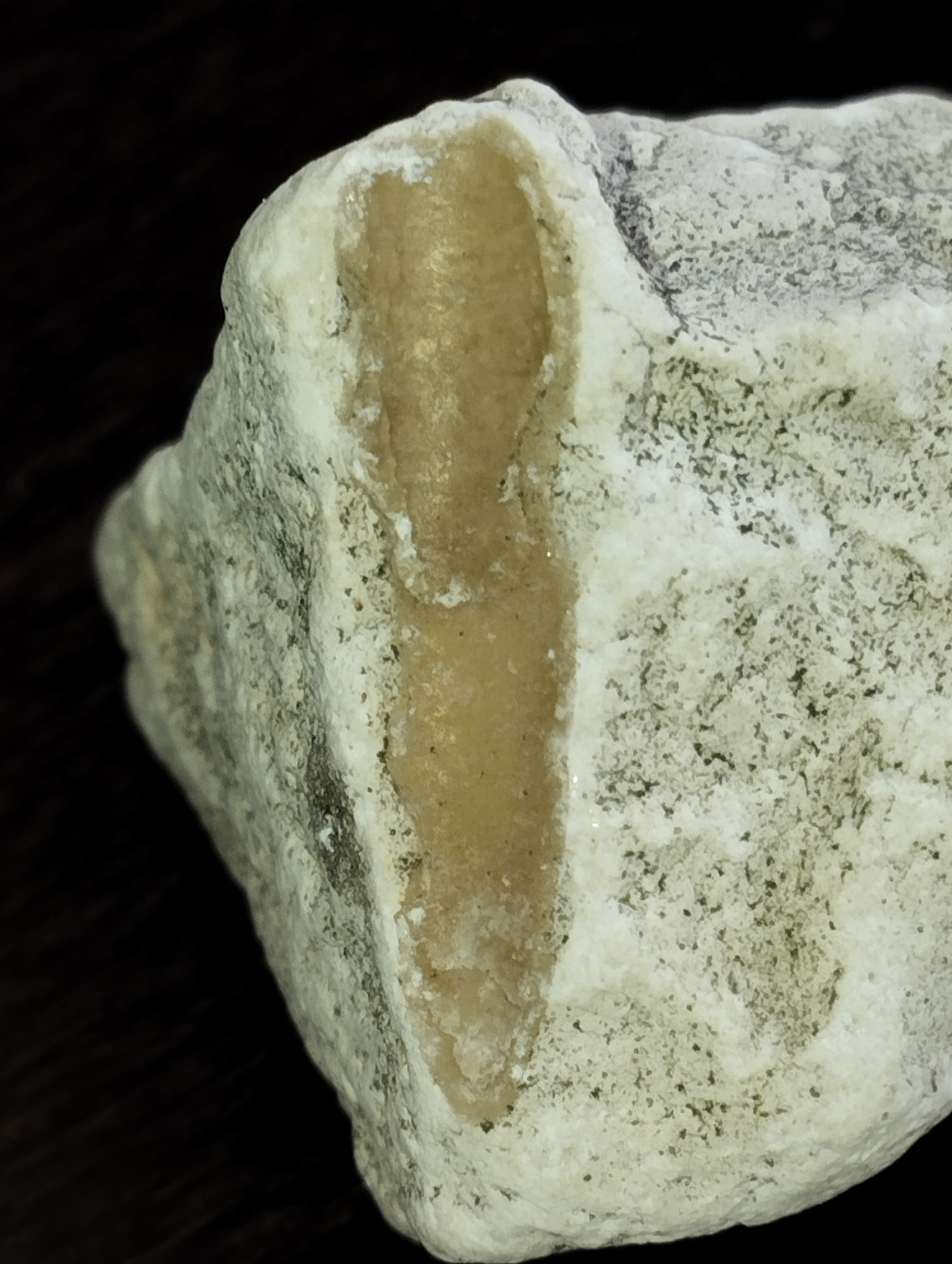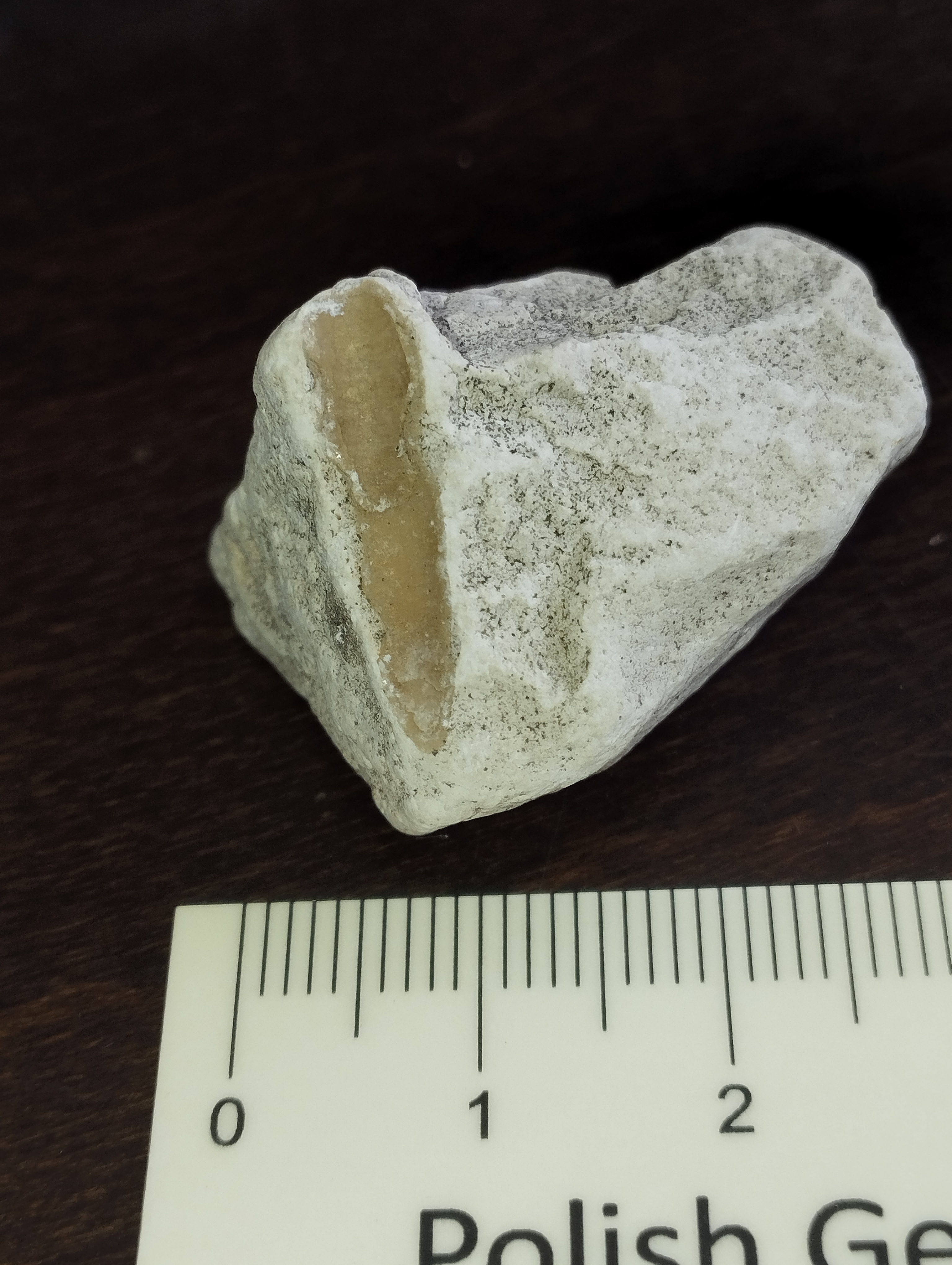 Dzień dobry. Znalazłem taki okaz w żwirku ozdobnym przy placu zabaw. To ząb sphenodusa czy belemnit? Nie jest cały, została grubsza warstwa. Z góry dziękuję i życzę ciekawych znalezisk.