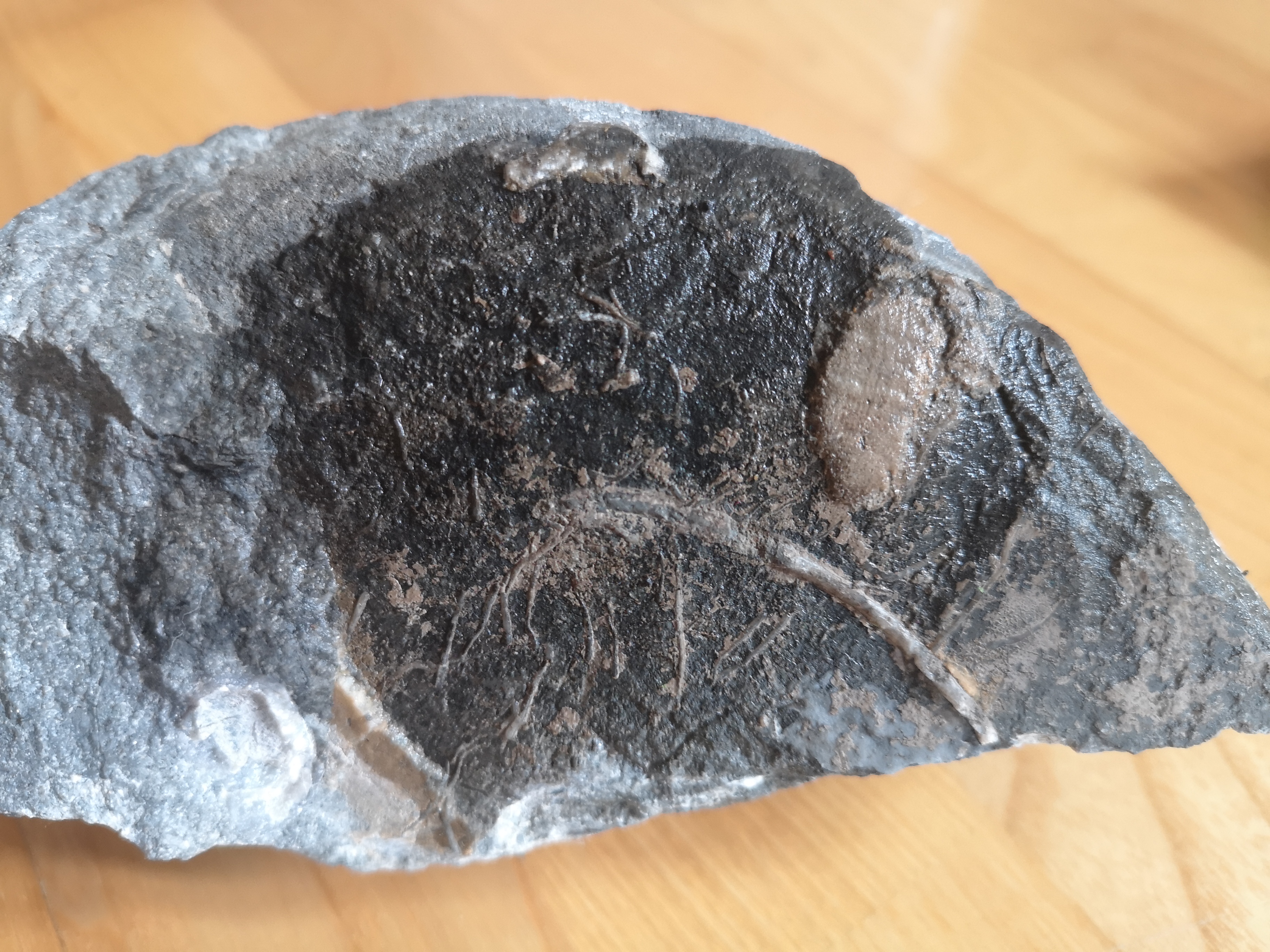 Nadal się waham, czy to krynoid, ale nie mam lepszego pomysłu. Z drugiego zdjęcia wnoszę, że cały ten blok to może być amonit. Dodatkowo, na ostatnim ujęciu widać przekrój przez głowonoga. Jest też kilka innych, fragmentarycznych skamieniałości.