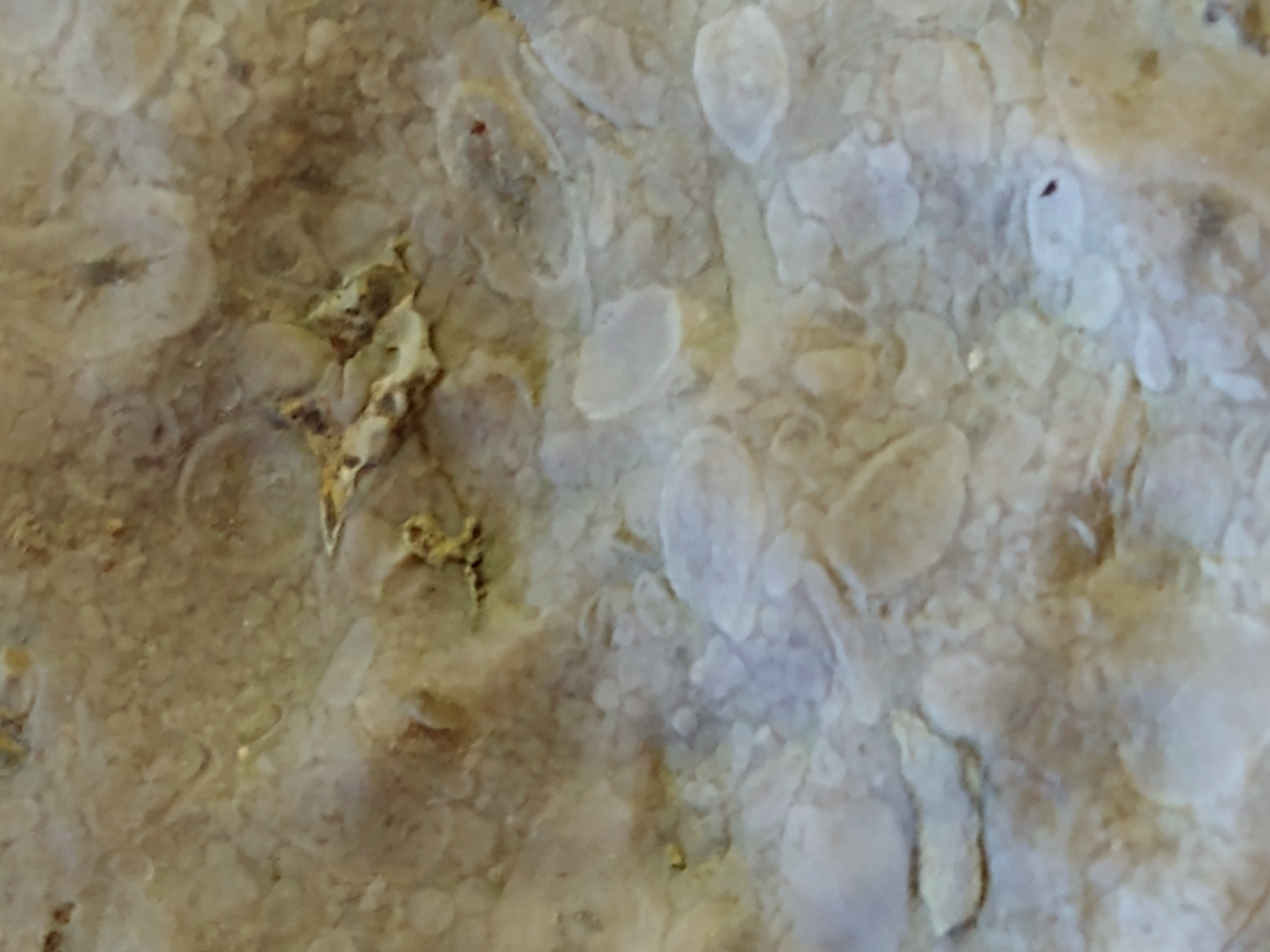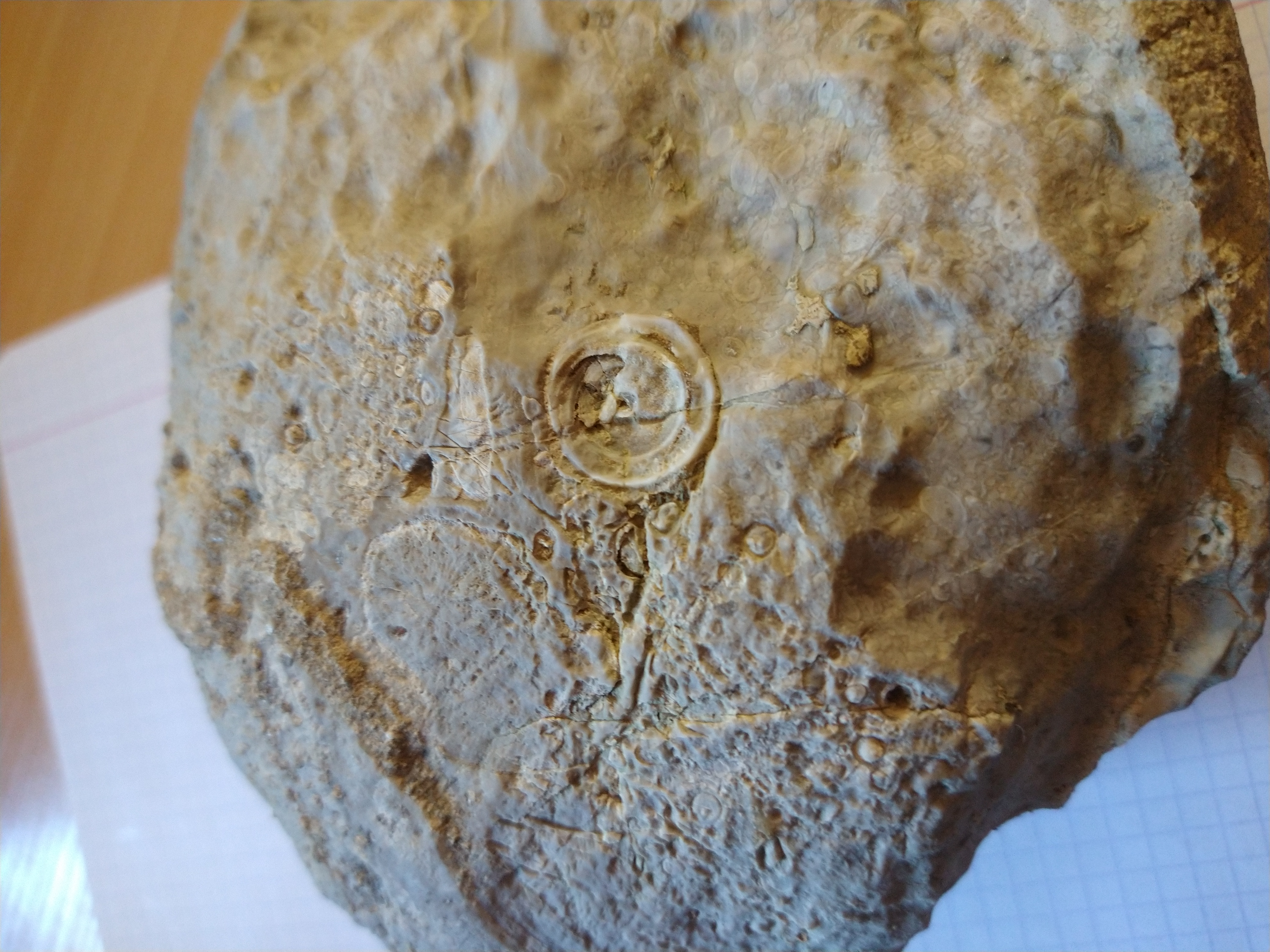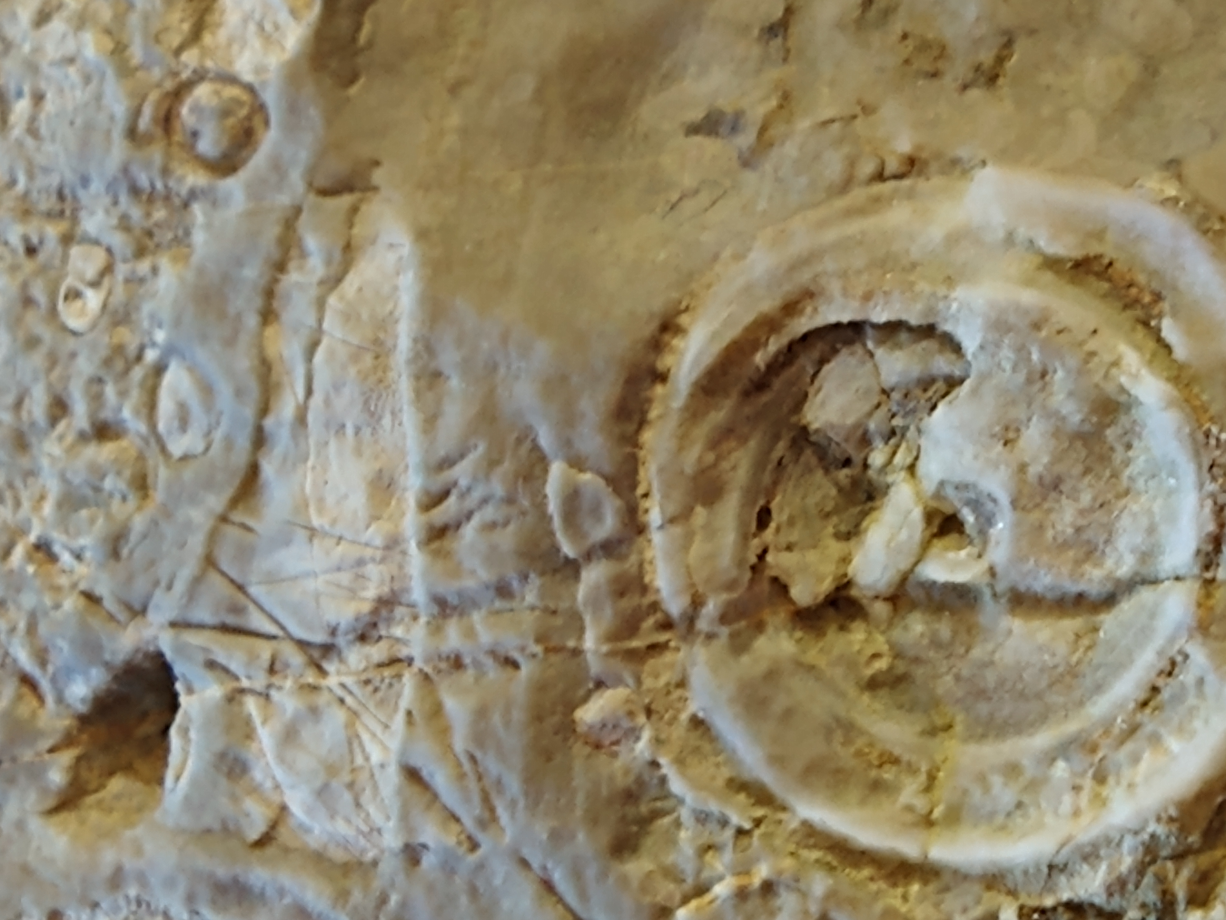 Znalazłem ostatnio na dnie leśnego strumyka piaskowiec z dziwnymi śladami, których nie rozpoznaję. Większą część jego powierzchni pokrywają drobne przeważnie koliste lub owalne struktury ale mnie najbardziej interesują dwa kształty, każdy wyszczególniony na osobnym zdjęciu: koło o średnicy 1,5cm i coś co wygląda jak skorupa mięczaka, długość 2cm