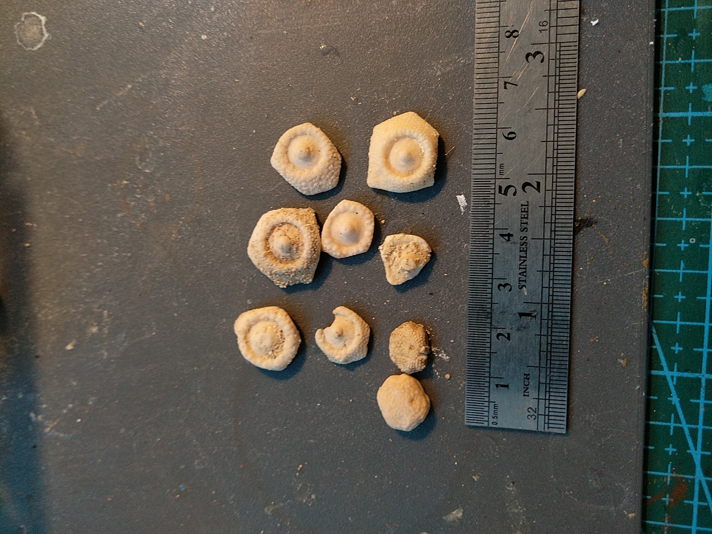 To fragmenty pancerzy jeżowców "Cidaris" z brodawką, gdzie znajdował się kolec.